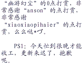 PS:非常感谢“幽游幻尘”的0点打赏,非常感谢“anson”的点打赏,非常感谢“xiaoxiaopihaier”的点打赏,么么哒*づ。