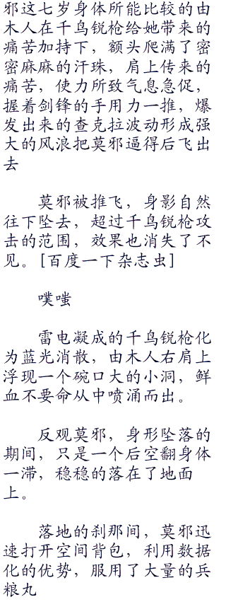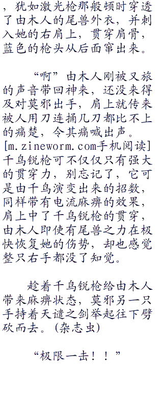 一道深蓝色的光柱立即从莫邪的双指尖处激射而出,犹如激光枪那般顿时穿透了由木人的尾兽外衣,并刺入她的右肩上,贯穿肩骨,蓝色的枪头从后面窜出来。