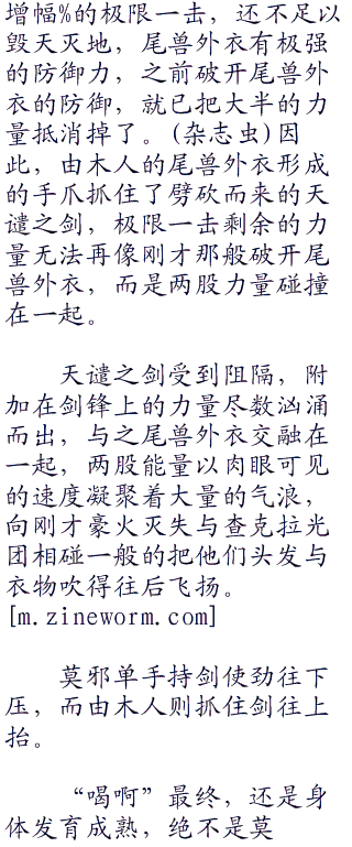 超越极限的力量的确强大,但仅是2级增幅%的极限一击,还不足以毁天灭地,尾兽外衣有极强的防御力,之前破开尾兽外衣的防御,就已把大半的力量抵消掉了。因此,由木人的尾兽外衣形成的手爪抓住了劈砍而来的天谴之剑,极限一击剩余的力量无法再像刚才那般破开尾兽外衣,而是两股力量碰撞在一起。
