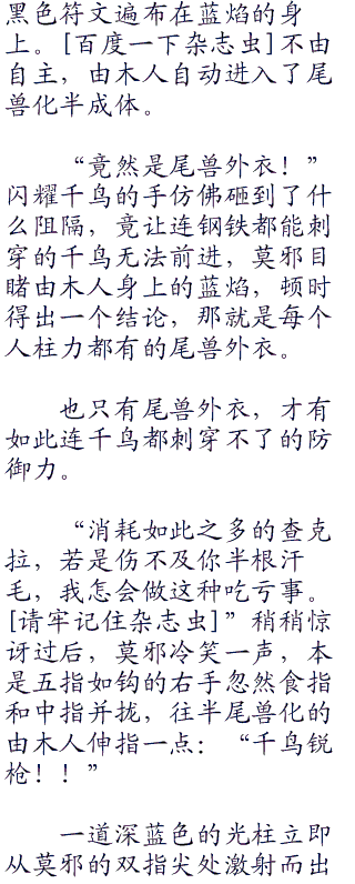 “竟然是尾兽外衣!”闪耀千鸟的手仿佛砸到了什么阻隔,竟让连钢铁都能刺穿的千鸟无法前进,莫邪目睹由木人身上的蓝焰,顿时得出一个结论,那就是每个人柱力都有的尾兽外衣。