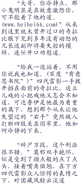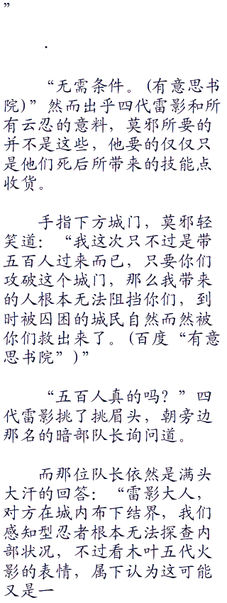 “哦?你说那个拥有岚遁的血继限界者啊。”莫邪仿若没什么印象似的想了想,然后满脸无害跟说家常事一般,说道:“身为云隐村的忍者竟然没有经过同意就擅自闯进木叶的区域,我就把他当做试图破坏木叶产物的敌人逮捕了,不过他的实力倒是很不错,几个人竟然压不住他,见他不断挣扎,万一真被他挣脱开来伤害到我的人怎么办?因此,我就命人打断他的四肢,现在他啊应该像条死狗那般躺在囚牢里吧!”