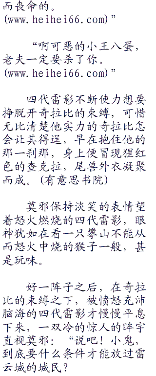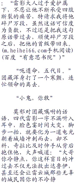 莫邪在四代雷影心中厌恶值秒秒暴增,尤其是听到莫邪那话中三句不离雷云城已是木叶产物的刺激语言,更是让四代雷影情绪差点没失控暴走,一双闪烁电光的眼眸注视着城墙上的莫邪,低沉又咬牙利齿的字句从四代雷影牙关中蹦出。