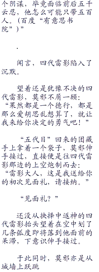 最后一句话,莫邪眼眸中和脸上都流露了肆意的挑衅之色,显然是故意在激怒四代雷影。