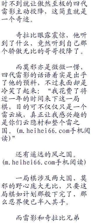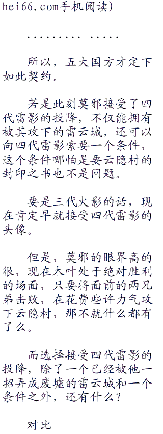 按照莫邪所说的那般,若是他们兄弟二人输了,没有领袖的云隐村,再也不是威慑忍界,屹立在所有忍村第二位的云隐村,真的会被莫邪除名的。