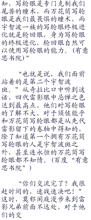 而四代雷影听完后,则是脸色惊变:“竟然是宇智波一族传说中的须佐能乎,但那不是万花筒写轮眼的奥义吗?为什么火影小鬼的轮回眼也能施展?”