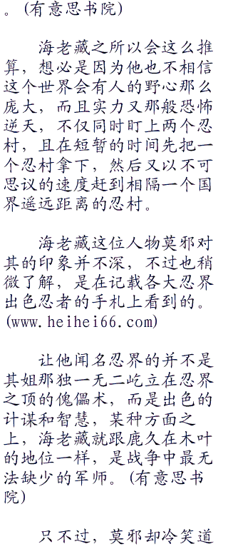 “阁下真是好算计,处心积累的设下这个局,想必目的就是为了这一刻吧?”海老藏仰首望着莫邪,面无表情的说道:“先以使者被杀的阴谋吸引忍界的注意力,让人以为你们木叶和云隐村互相开战,实质上暗地里却是在针对我们砂忍村,真是了不得的心智,那封请求我们沙忍出兵支援的密函是陷阱,那封被情报组送回来的情报书也是假的吧!他们都被你给杀了。”