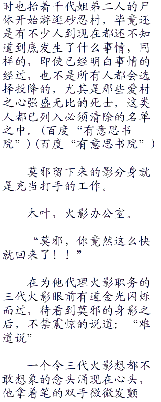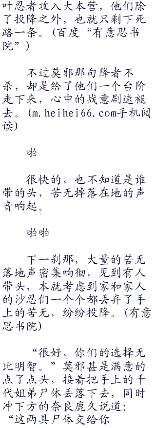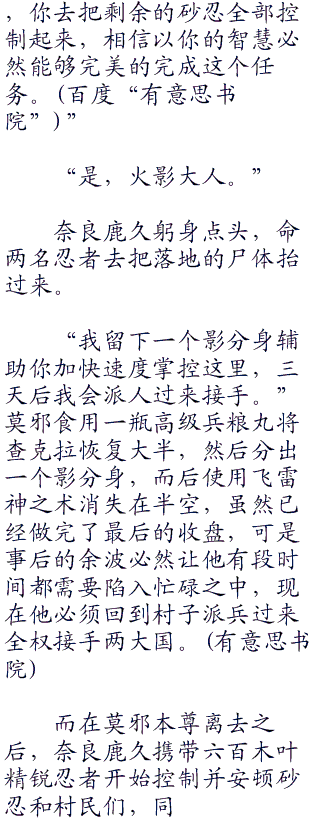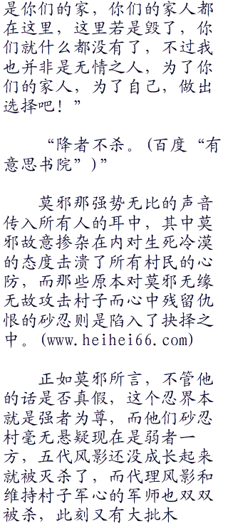 “千代和海老藏已经死于我手,就算你们汇聚全部力量,没有风影和影级强者的你们,砂忍村等同于被我们木叶所占据,现如今,摆在你们面前的只有两个选择。此处乃