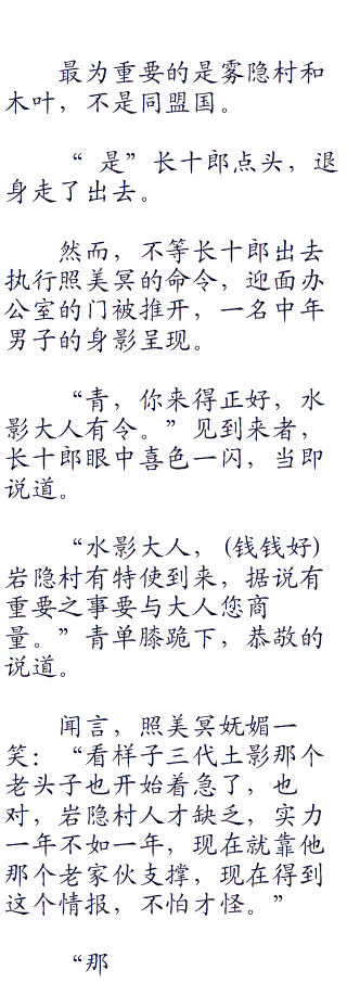 根据莫邪和木叶所有族长私下所做的约定,派兵前去帮助远在云隐村和砂忍村的团藏和奈良鹿久,在莫邪前卫的征服策略与他们出色的办事能力之下,三天时间不多不少,团藏和奈良鹿久便飞信回来,他们已经成功的占据了雷之国和风之国,而两大国的大名与那些贵族全部都被他们所囚困。