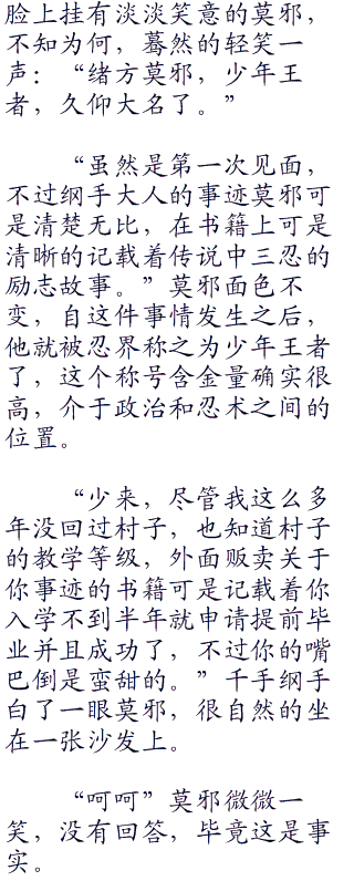 因此,就算三忍的千手纲手和自来也不回来,莫邪也丝毫不担忧。