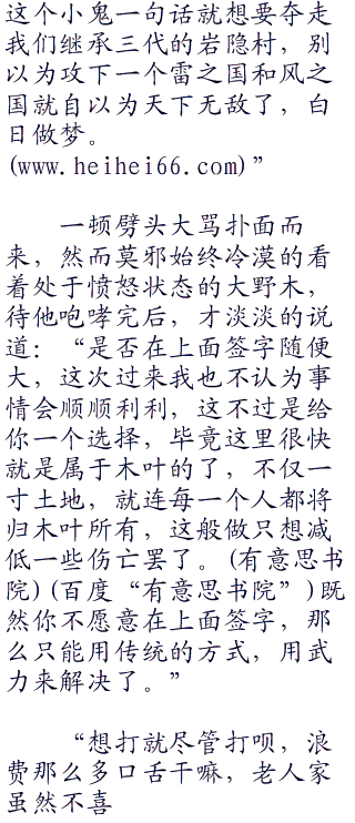 两天枰大野木是一个身高非常矮小的老人,五大忍村中的其四都已经发展到了五代继承,而现在岩隐村的却依旧是三代持家,不得不说,岩隐村的人才连凤毛麟角这个词语都没资格运用,若非是尘遁这个血迹淘汰与五尾人柱力这两大战力镇守村子,恐怕早就被踢出五大忍村之列了。