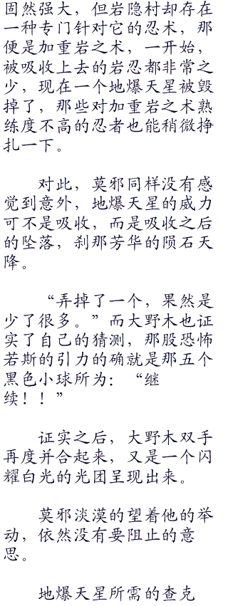 随着大量的碎石升上空中,五个地爆天星的效果再次加强,这下子,下方的岩忍也都受到了影响,纷纷双脚离地,浮空而起,充满恐惧的声音更是瞬间响彻起来。