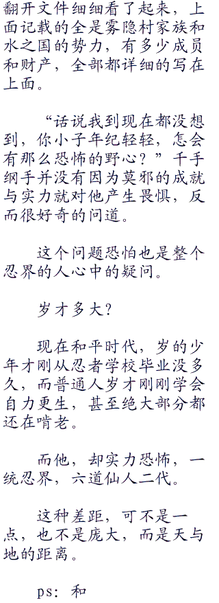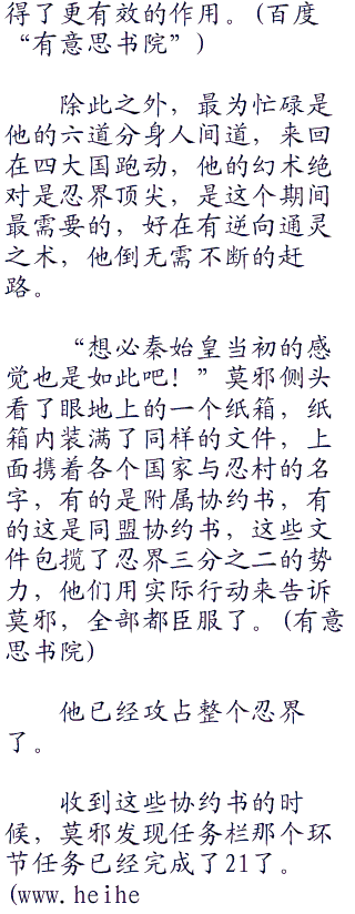 人手不足的情况第一次出现,莫邪也没有在隐藏着秽土转生这个底牌,也都全部派遣出去,甚至还专门让人去收拾一些幻术强者的尸体,想要快速掌控四大国让那些忍者臣服,必须要有高级的洗脑,莫邪在这方面提供了前世现代的专业催眠,与幻术融会贯通完全可以起