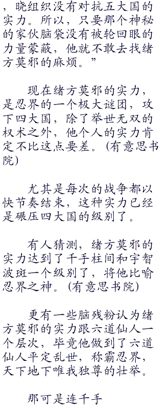 这一点,从佩恩自称为神语气时刻带有无视一切的狂傲之中即可了解,但是,宇智波带土和绝可是知道,长门的轮回眼不过是移植而已,即使其体内有千手一族的血脉,也仅不过才将轮回眼激发十分之三四左右,从他消耗生命力施展地爆天星与后期斑爷随手就是几个地爆天星的对比中即可了解。