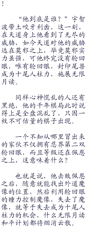 然而,这还不是让狂傲如佩恩之所以这么评价天道的原因,而是施展完这一招,天道还显得气定神闲,像是没有消耗似的颠峰状态,让他相信了宇智波带土的话语,这个人的六勾玉轮回眼的确改良了他的轮回眼存在的瑕疵。