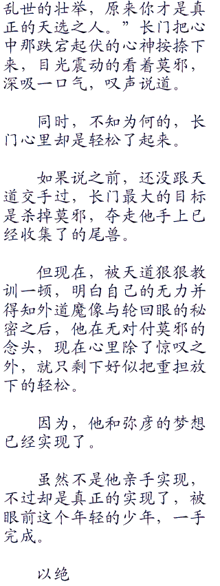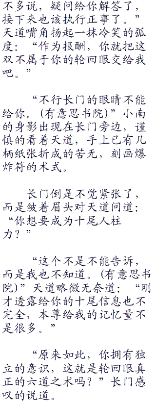 沉默,长门并非蠢人,从天道的几句问话中,他已经相信了自己的眼睛是被移植的,从很久之前,他就感觉自己和轮回眼缺少一种东西,即使是他将六道之术掌握熟练,这种感觉还是存在。