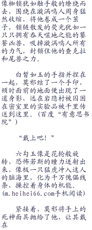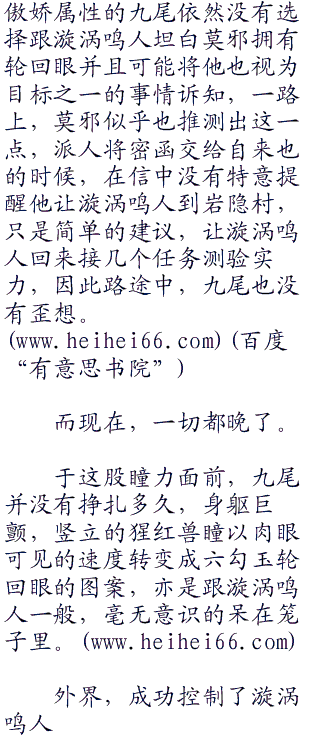 漩涡鸣人中招的同时,其体内的九尾也感觉到了那股震慑心神的瞳力侵入了这个尾兽和人柱力交流的空间,轮回眼的力量无疑是尾兽的绝对克星,在这股瞳力面前,力量只有一半的九尾身躯开始巨颤起来,竖立的兽瞳闪烁恐惧又疑惑的神色,上次也是因为这股瞳力而失去意识,现在简直就是在周而复始。