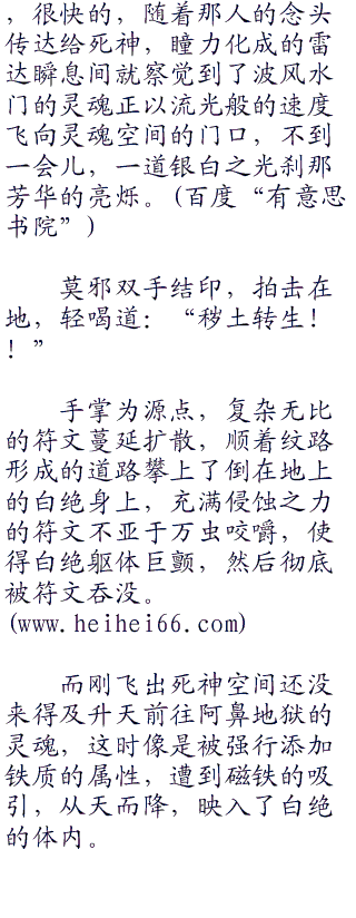 刹那间,莫邪双眸紧缩,六勾玉轮回眼的瞳力犹如天罗地网般的迸发出去,化作千万雷达在死神的灵魂空间极速寻找,很快的,便捕捉到了跟漩涡鸣人体内那股气息非常接近的灵魂,再结合这个世界被死神