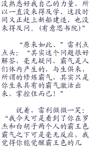 雷利有点惊讶:“咦,你还没有学习过霸气么?我还以为以白胡子的性格,早就一五一十的教给你了。”