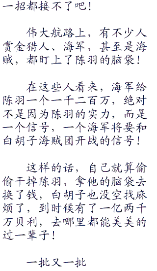 白胡子翘起二郎腿:“空和战国这一手玩的很恶心人,但是不得不说他们做的不错,一旦白胡子海贼团士气下降,他们正好过来讨伐,如果我们的士气没有下降,你的成长速度也会被限制,不会在短时间内成为他们的威胁,左右都是他们占便宜。”