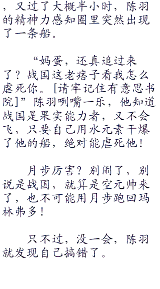 “站住的是傻子”一个闪烁瞬移到了自己小船上的陈羽听到了大船上战国的吼叫声,无语的耸了耸肩,控制着水流就开始飞速的离开。