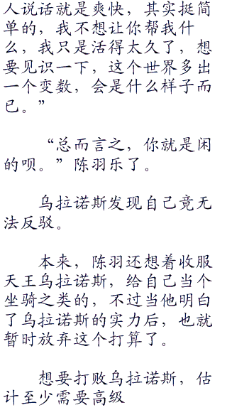 乌拉诺斯的身影慢慢在陈羽旁边浮现了出来,他不知道用了什么秘法,本来一百多米的身高,此时才十多米高,那张狰狞的龙脸看上去也正常了很多。