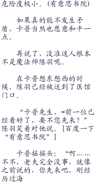 还没等卡丽说话,卡普已03经无奈的打断了他的话:“喂喂,我本来就没什么事,是你们非让我来复查的,现在还让我影响别人看病,是不是过两天还要告我官大压民呀。”