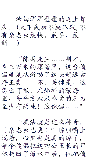 陈羽坐在岸边,他一点也不着急,作为傀儡的创造者,他能直接连通傀儡的视觉,看实况转播。