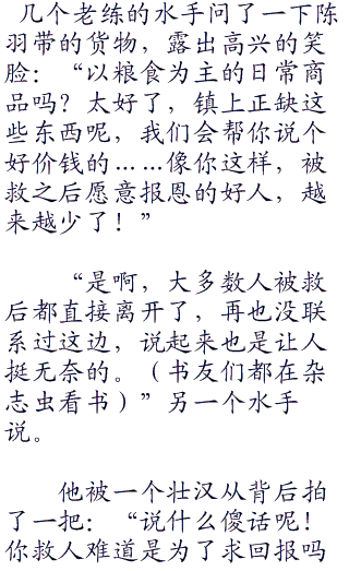 他在船上装了好多粮食之类的日常商品,然后开足马力,很快就到了风车村的海域。