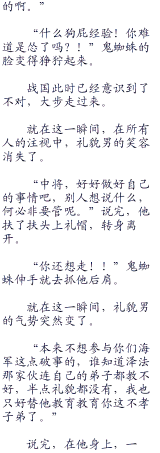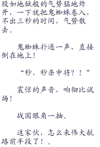 作为考核官的,是泽法的得意弟子之一,擅长生命归还的鬼蜘蛛,对于鬼蜘蛛这个海军本部中将,战国虽然不是很喜欢,但也不得不承认他实力不错,完全当得上海军本部中将这个名头。