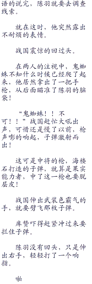 突然,一声冷笑传来:“不动手脚,仅凭气势击倒海军本部中将?世上根本就没有过这样的人!依我看,八成是刚才巴士底的那一刀余韵未消,才凑巧表现出了这个效果!”