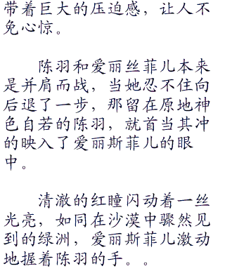 爱丽丝菲尔放慢了速度,好像是从陈羽身上吸取了一些安全感,清澈的面容上这才显出一份安定,“陈羽君,多谢你留下来陪我,不然这样的浓雾,我就不知道该怎么去做了。”