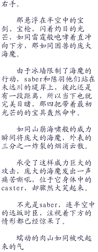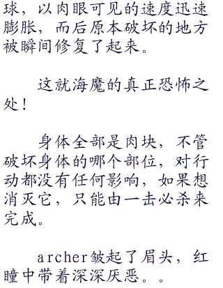 所以不管是saber、lancer还是rider,在本质上都把现在肆虐的海魔当作了自己肩负的责任,注视着眼前不断受伤却无限还原的海魔,三人都是心急如焚。