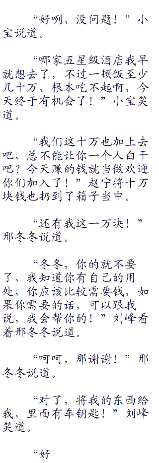 “那好走吧,我跟你们说,你们输定了,我们可是一箱子!”小宝说道。
