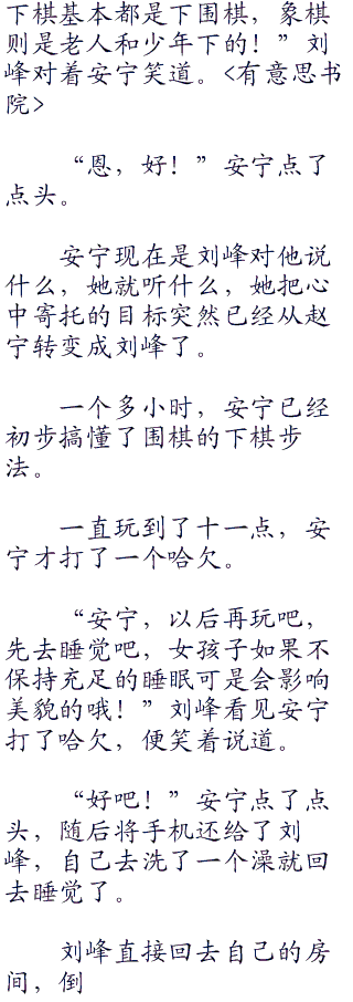 刘峰和小宝上楼之后看见黎伟和冬冬正在下棋。h ei6 6 co m