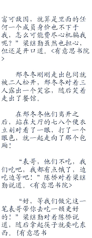 邢冬冬和昨天的三个黑衣人一起去向了梁继勤说好的餐馆包间中。