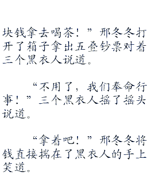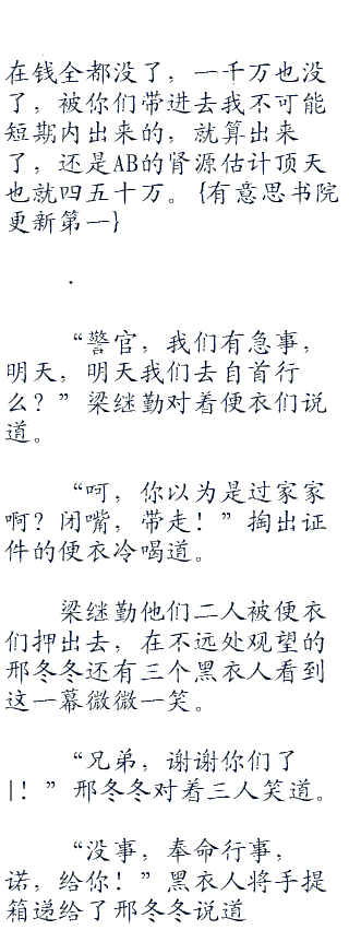 “不了,钱带来了没?你要知道耍我们的后果很严重,不是你能够承担的!”其中一个黑衣人看着梁继勤说道。