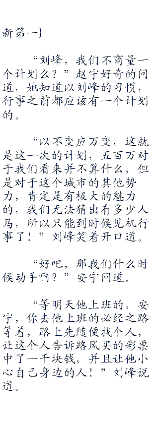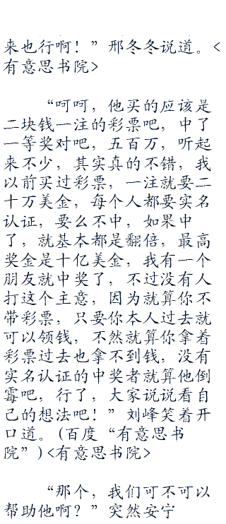 “是真的,这个人叫做路风,刚到这个城市,以前家里挺有钱的,但是后来破产了,现在住在花田小区,和他走的比较近的就是他的同时方秋平,方秋平是一个彩票迷,那天路过彩票站路风也凑热闹买了一注,你们也知道不买彩票突然买一注肯定很快就忘记了,所以这个路风就忘记自己买了彩票,但是方秋平知道路风中了五百万,所以就想要使坏心眼,不告诉路风,想要将路风的彩票要过来自己去兑换,这个消息已经走漏了,现在道上的人都打这个主意!”邢冬冬说道。
