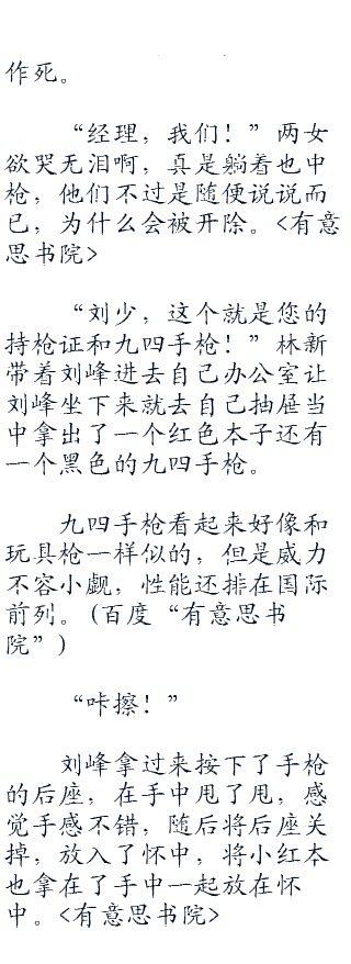 “好的,九四手枪我这里也有,是工作人员用的,我让他们匀出来,保证刘少您过来就可以看见手枪还有持枪证,刘少,我准备好就去公司