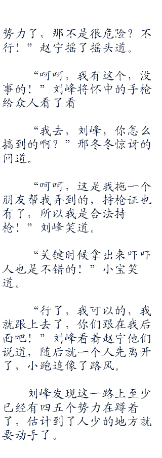 第二天,上午,刘峰醒过来将枪放在怀中,手枪中一共有着六颗子弹,不过六颗子弹刘峰也觉得足够了,毕竟社会管制严密,一般黑社会也不敢用枪,最多用刀而已,再说了,这个城市还没有那种敢用枪的组织,当然了,刘门除外。w.ww..c.om