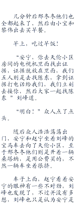 “那我们明天动手吧,安宁你去拿证据,我和赵宁还有冬冬他们在天伦小区寻找那个陈东,找到后立刻将他制服!”刘峰道。