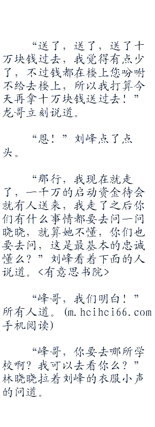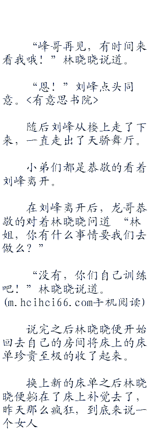 “小龙,小虎,最近几天就不要营业,你们专心训练吧,楼上的永远都是林晓晓的房间懂么?不准任何人进去一步,还有就是今天我就要离开,我离开后你们都要听林晓晓的话,谁不听自己知道惩罚的!”刘峰站在楼上道。
