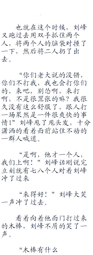“喂,你们不是很厉害嘛?有没有胆子先拿下我再去收拾他们啊?当然了,你们是没有这个机会收拾他们的,因为你们都会被我打翻在地!”刘峰不屑的看着眼前的这一百多人说道。