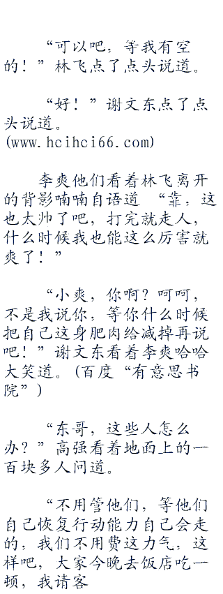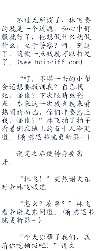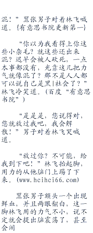 林飞看着那几个用木棒打他的人,脸上露出一丝冷笑道 “你们几个干得不错,我赏你们一人一拳!”