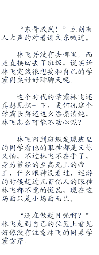 “因为我要特别照顾你呀,从来没有人敢说要打我,而且你不仅说了,还这么做了,如果我不特殊照顾你一下不是很没有面子么?”林飞看着嚣张男子冷笑的开口道。