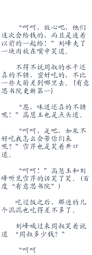 “是雪芹来了啊?还带了朋友,好,这顿我请了,我这就去给你们准备!”中年男子也就是周叔对着雪芹笑着说道。