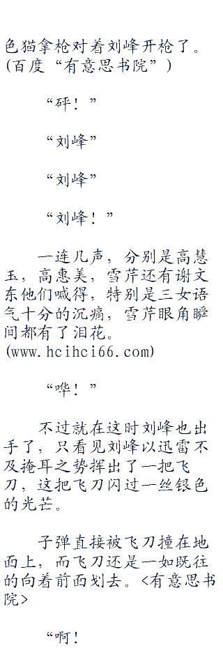 “刘峰,小心!”高慧玉,高惠美,雪芹看见色猫拿出枪指着刘峰,立刻担心的出声喊道。