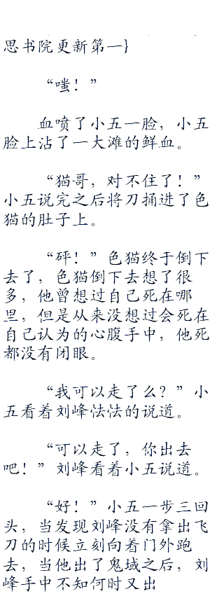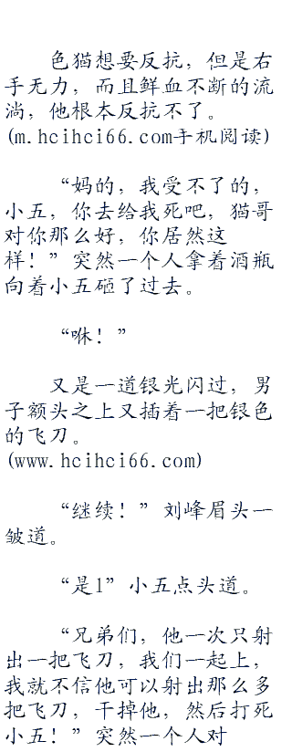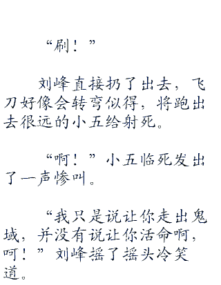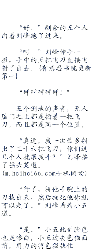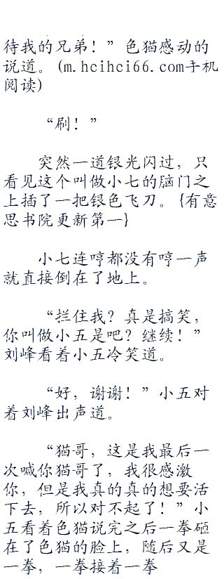 “恩,我人好,送你们兄弟一起上路吧,这里一共有七把飞刀,而你们一共还有八个人活着,所以呢,有一个人可以活着,这样吧,你们谁打的这只猫最凶我就放他离开鬼域好了!”刘峰对着色猫的小弟们说道。