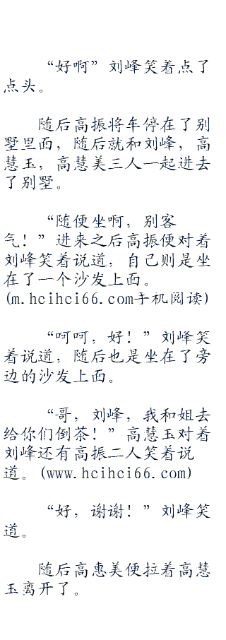 随后雪芹小跑进了院子,在雪芹进去之后刘峰对着高慧玉,高慧美两姐妹笑道 “好了,现在我送你们回去吧!”