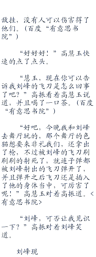 “慧玉,你说什么?刘峰的飞刀厉害?”高振惊讶的看着高慧玉问道。
