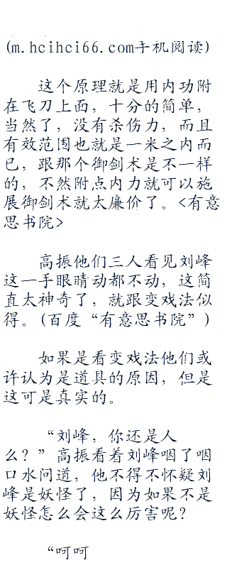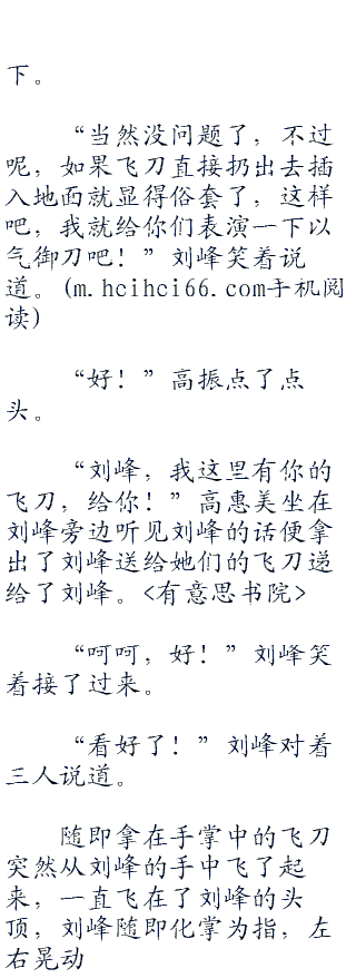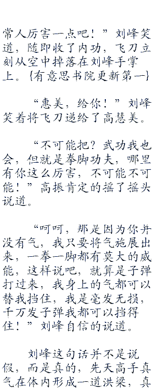 “刘峰,你真厉害,我本来以为你飞刀是最厉害的呢,没想到你居然这么厉害,你怎么做到的啊?”高慧玉看着刘峰惊讶的问道。